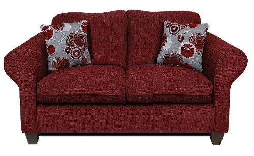 #Libby Loveseat by Chelsea Home Furniture. Features: Solid Wood Frame No Sag Steel Springs Tahoe Burgundy Fabric Upholstery 1.5 Density Dacron Wrapped Cushions Celeste Ruby Print Throw Pillows Included Square Block Feet Minor Assembly Required Dimensions: 64 W x 36 D x 39 H Weight: 135 Lbs.